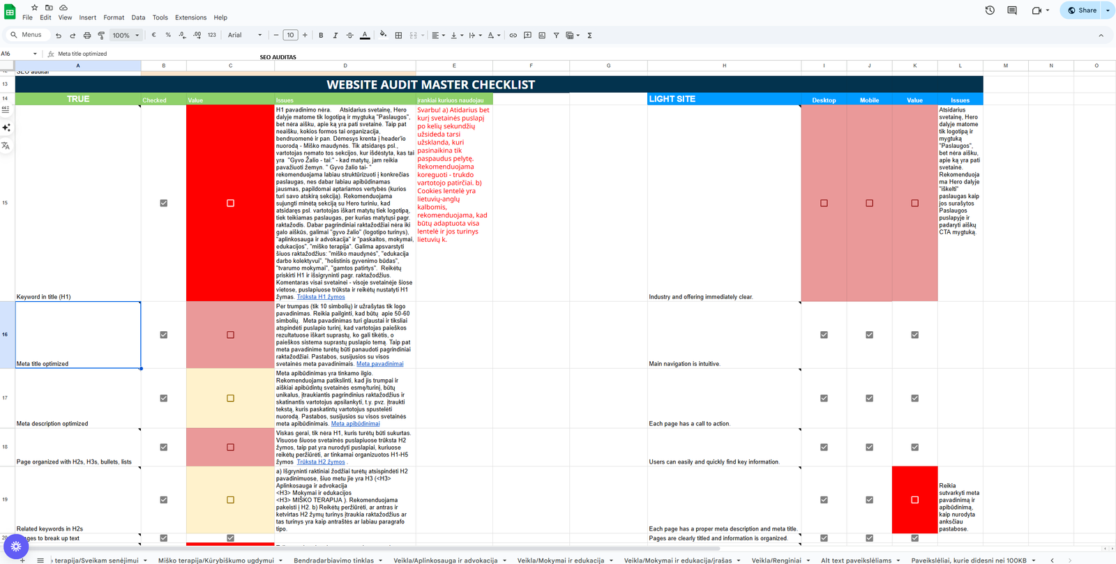 - Išsamus SEO auditas – aiški svetainės analizė su nustatytomis techninėmis ir turinio klaidomis bei konkrečiais pasiūlymais matomumui „Google“ gerinti.